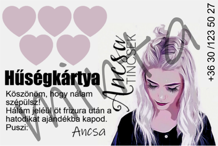 Az első alkalommal, amikor fonásra érkezel hozzám, kapsz egy pecsétgyűjtő kártyát. Öt frizura után a hatodikat ajándékba kapod hálám jeléül, hogy gyakran szépülsz nálam. Természetesen ha betelt, kapsz egy újat :)
